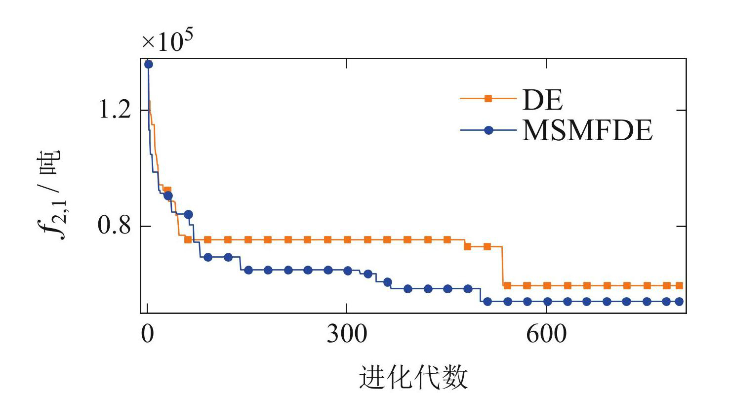 所提算法在求解所提模型时有效性可通过任一阶段验证,比如第2阶段(k =2). 图5为2种算法在f2,1上的迭代曲线. 从图中可以看出,MSMFDE算法在整个迭代过程中始终优于DE,f2,1的值更低且收敛更快,表明考虑一致性有助于加快铜精矿消耗,提高资源利用率. 而在未考虑一致性的情况下,f2,1在DE算法中始终较高,说明配比波动大,资源利用率低.