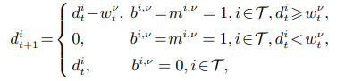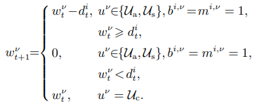 定义T + = T ∪ {0}表示包括返回基地的任务集合. 定义 mi,ν ∈ {0,1},bi,ν ∈ {0,1}和 ∈ {0,1}分别表示一个二进制变量,其中 = 1时表示智能体ν去执行任务 j,且执行任务 j 之前在执行任务 i. D(p i,pj)表示任务节点i到j的欧几里得距离,表示初始时刻任务i的紧急程度,s(·)表示单位阶跃函数. 在一个批次的任务分配方案中,多架无人机或无人车可以分别协同执行对抗任务或夺控任务. 因此,定义− 1表示在某一时刻任务 i被分配给 架无人机或辆无人车所获得的奖励. 在以上定义下,总路程代价函数为