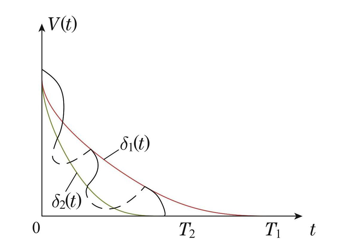 情况 2 若在时刻t0 被激活,存在t时刻V(t)接触边界δ2(t),此时V (t)由休息区域Γ2(t)进入缓冲区域Γ3(t),且在缓冲区域维持休息状态. 存在时刻使V(t)接触边界δ1(t),控制器进入工作状态,并在接触边界δ2(t)前维持工作状态. 重复若干次,有时,被激活,此时控制器处于休息状态; 时,被激活,控制器处于工作状态. 当