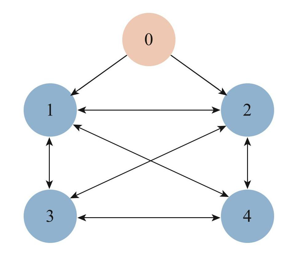 考虑由1个领导者与4个跟随者组成的多智能体系统,其满足细节平衡条件的拓扑图如图2所示. 系统的Laplacian矩阵为