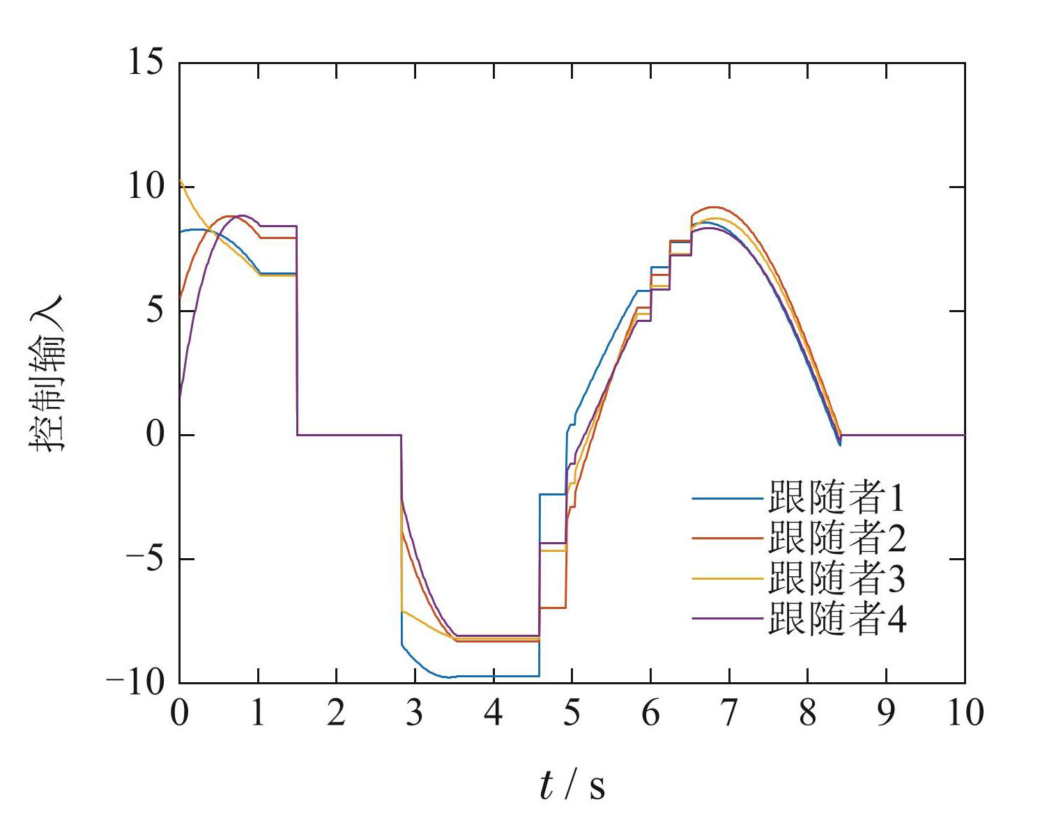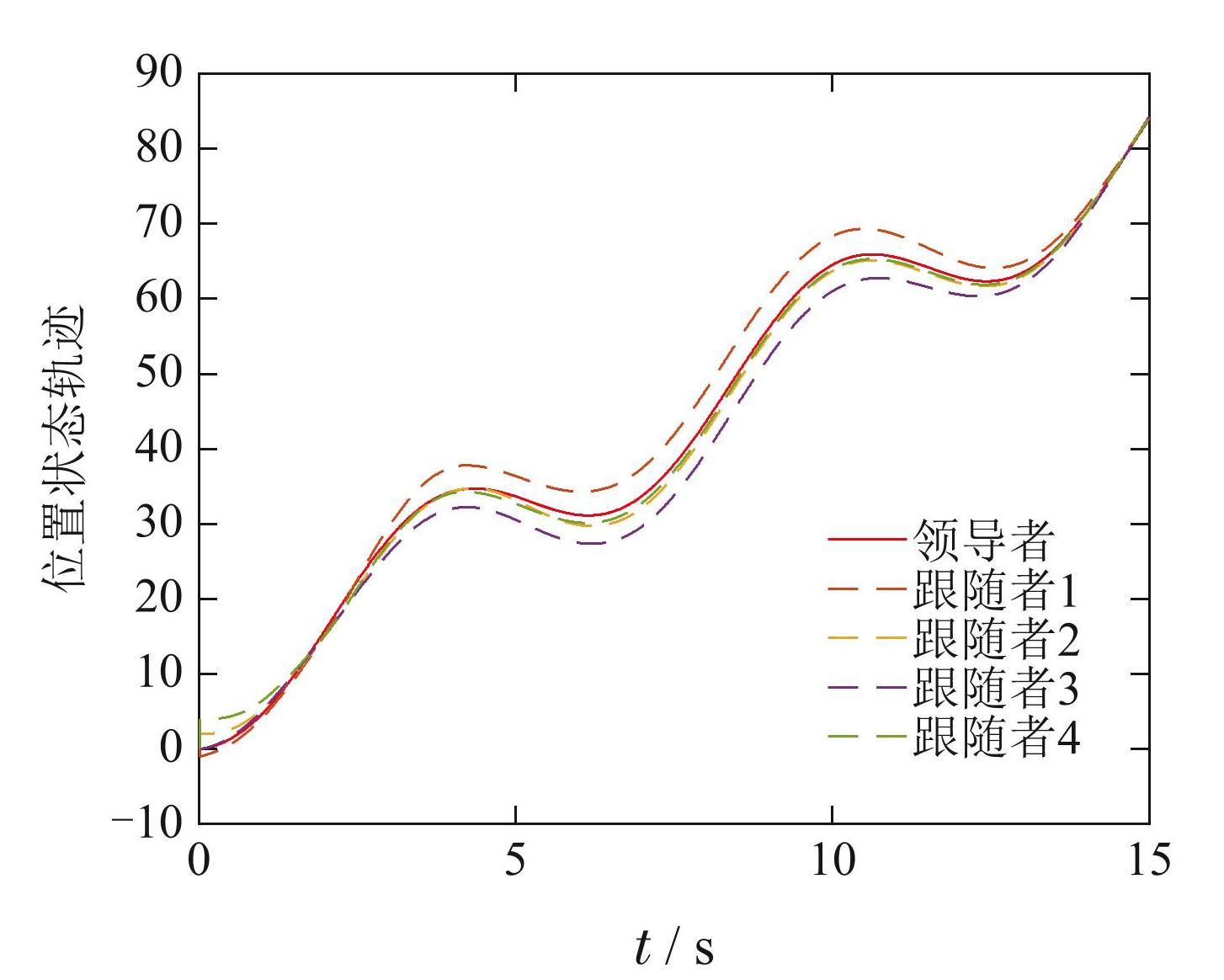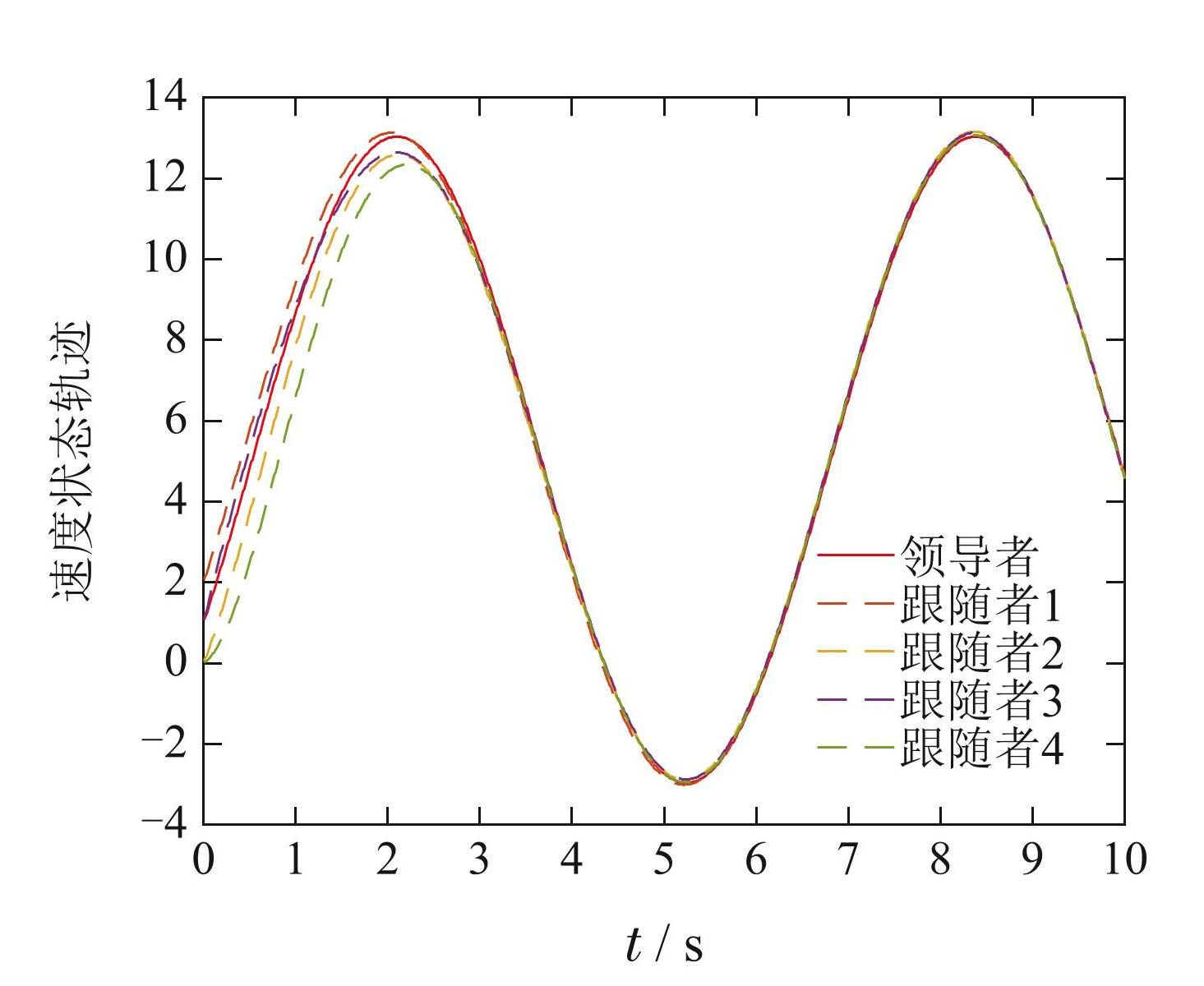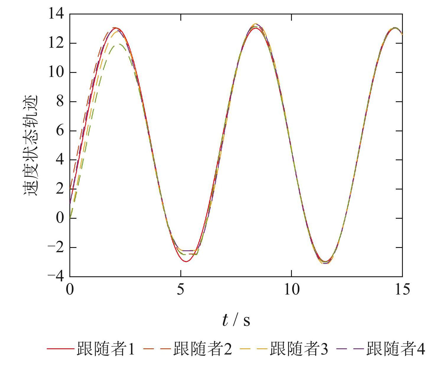 图7给出了域分割间歇通信下多智能体位置状态轨迹,表明跟随者与领导者之间的位置误差在14.5 s 达到一致. 图8为域分割间歇通信下多智能体速度状态轨迹,可以看出跟随者与领导者之间的速度误差在13.1 s达到一致.