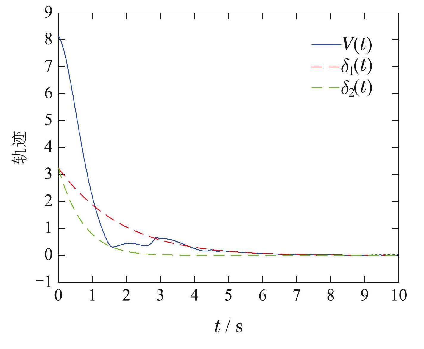 图5V(t),δ1(t)和δ2(t)的轨迹