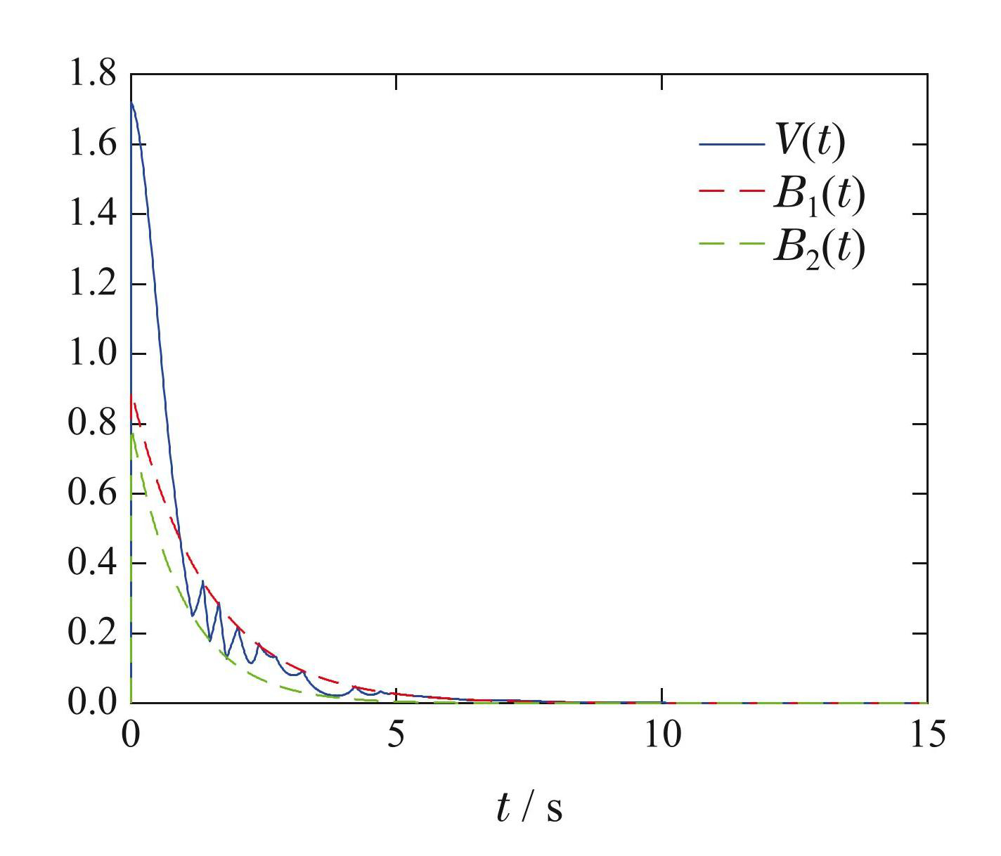 图9域分割间歇通信下V(t),B1(t)和B2(t)的轨迹
