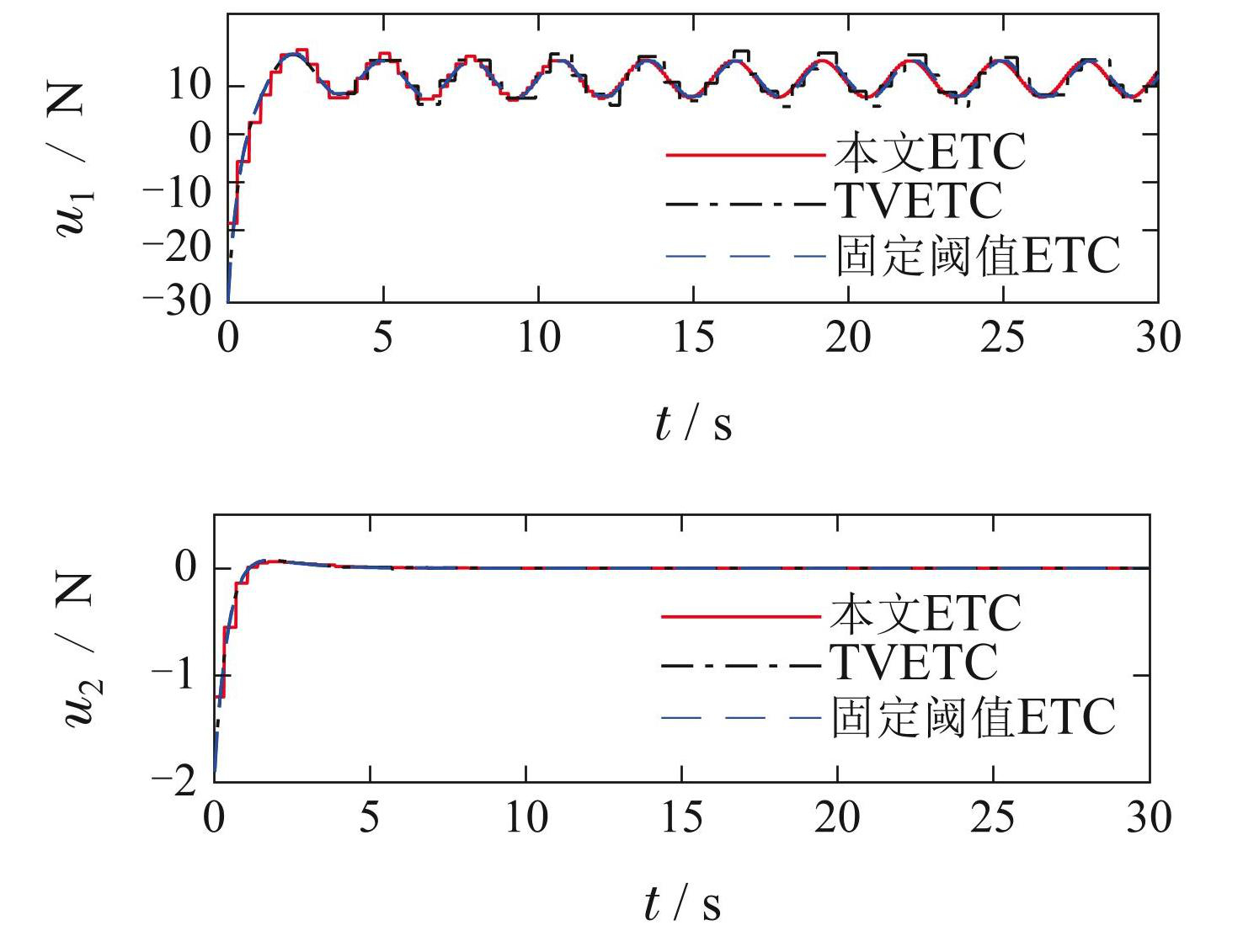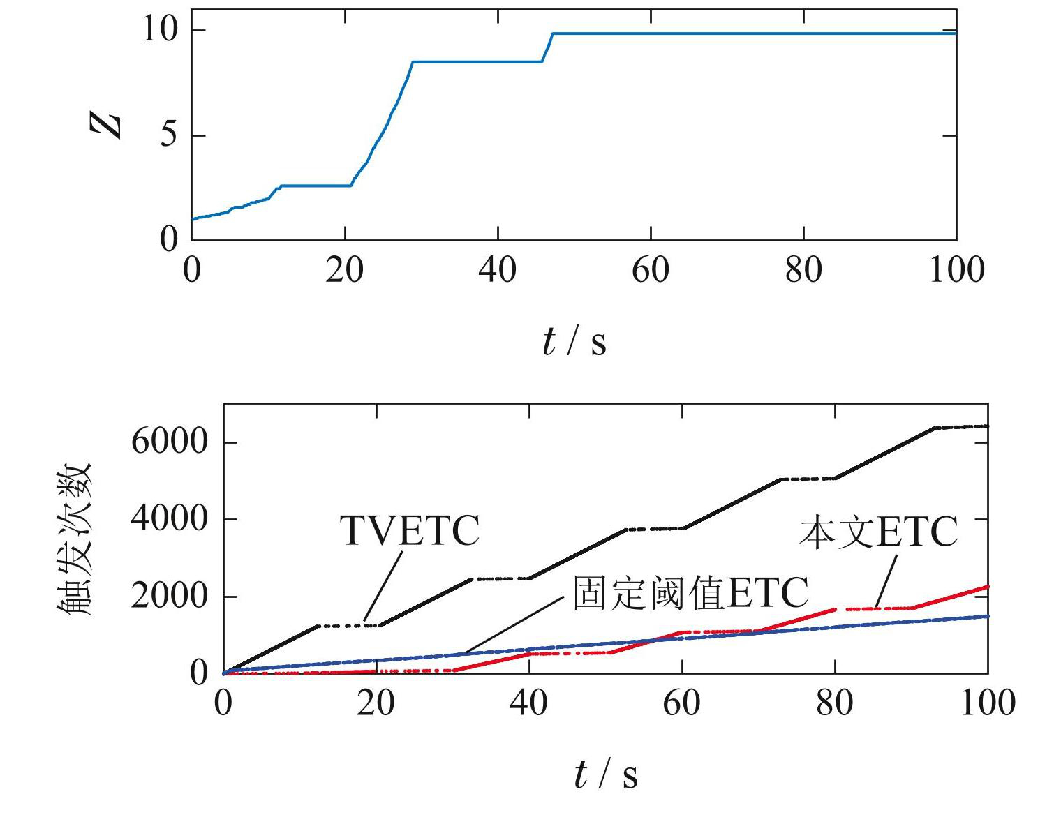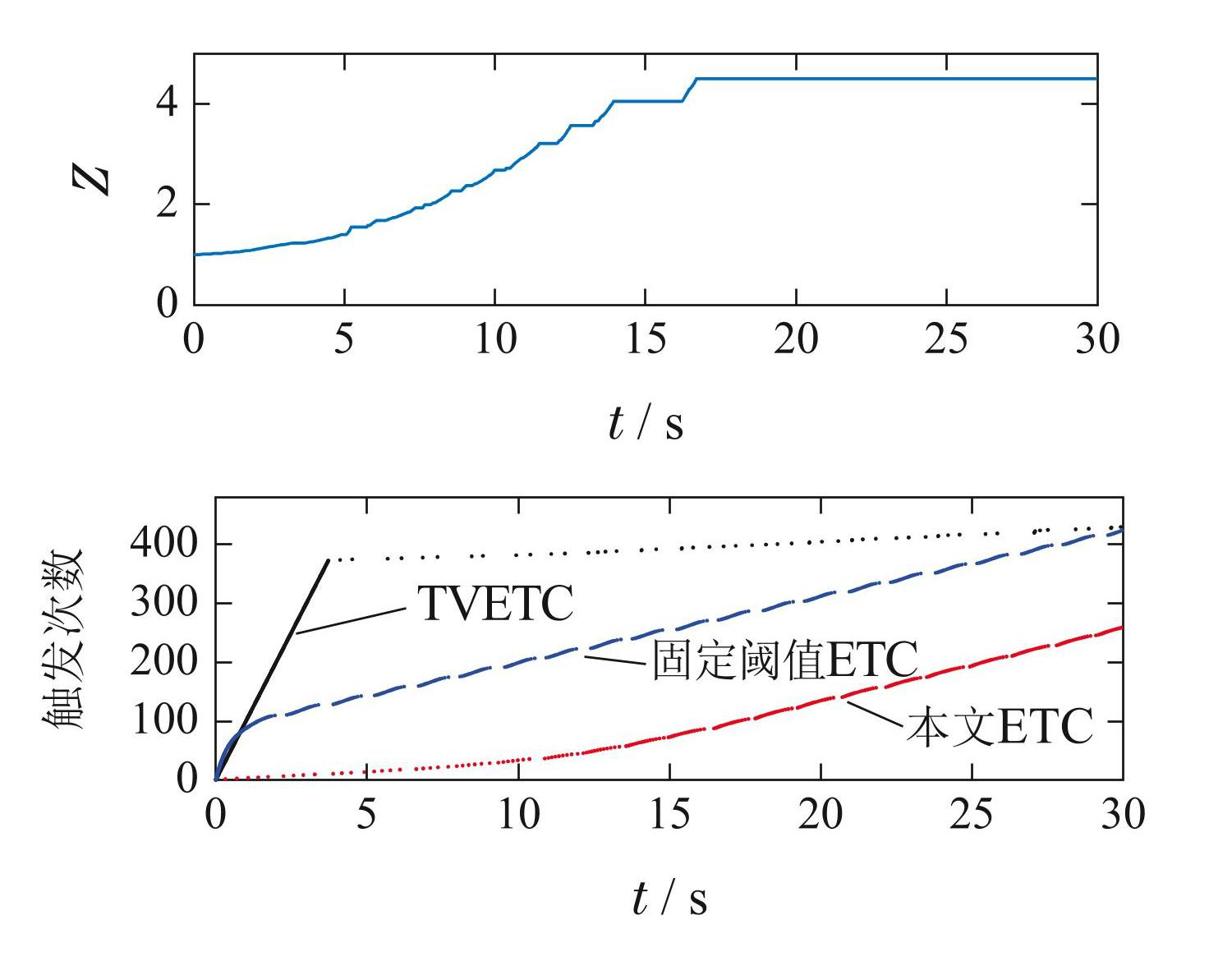 3)图6的触发次数图中,每个点代表每次触发的时间和对应的触发次数. 这一结果显示,在控制初期(仿真开始的前5 s),本文ETC的触发次数仅为TVETC的 3.73%和固定阈值ETC的9.79%. 这是因为系统处于瞬态阶段时存在较大的跟踪误差和控制信号变化速率,以这些信号为参考的ETC会随之提高触发频率; 而根据本文的触发策略,由于此时τa较大,允许更大的实时/目标控制输入偏差,因此在保证稳定性的同时保持了较低的触发频率. 结合图5可以发现,到达稳态时,固定阈值ETC与本文ETC有相近的触发频率和跟踪误差,虽然TVETC的触发频率极低,但跟踪误差很大. 在整个控制过程中,本文ETC,TVETC和固定阈值ETC 的最小触发间隔分别为: 0.051 s,0.010 s 和 0.005 s. 并且由于控制初期的优势,本文ETC总体上有更少的触发次数,约为其他两种ETC的64%;