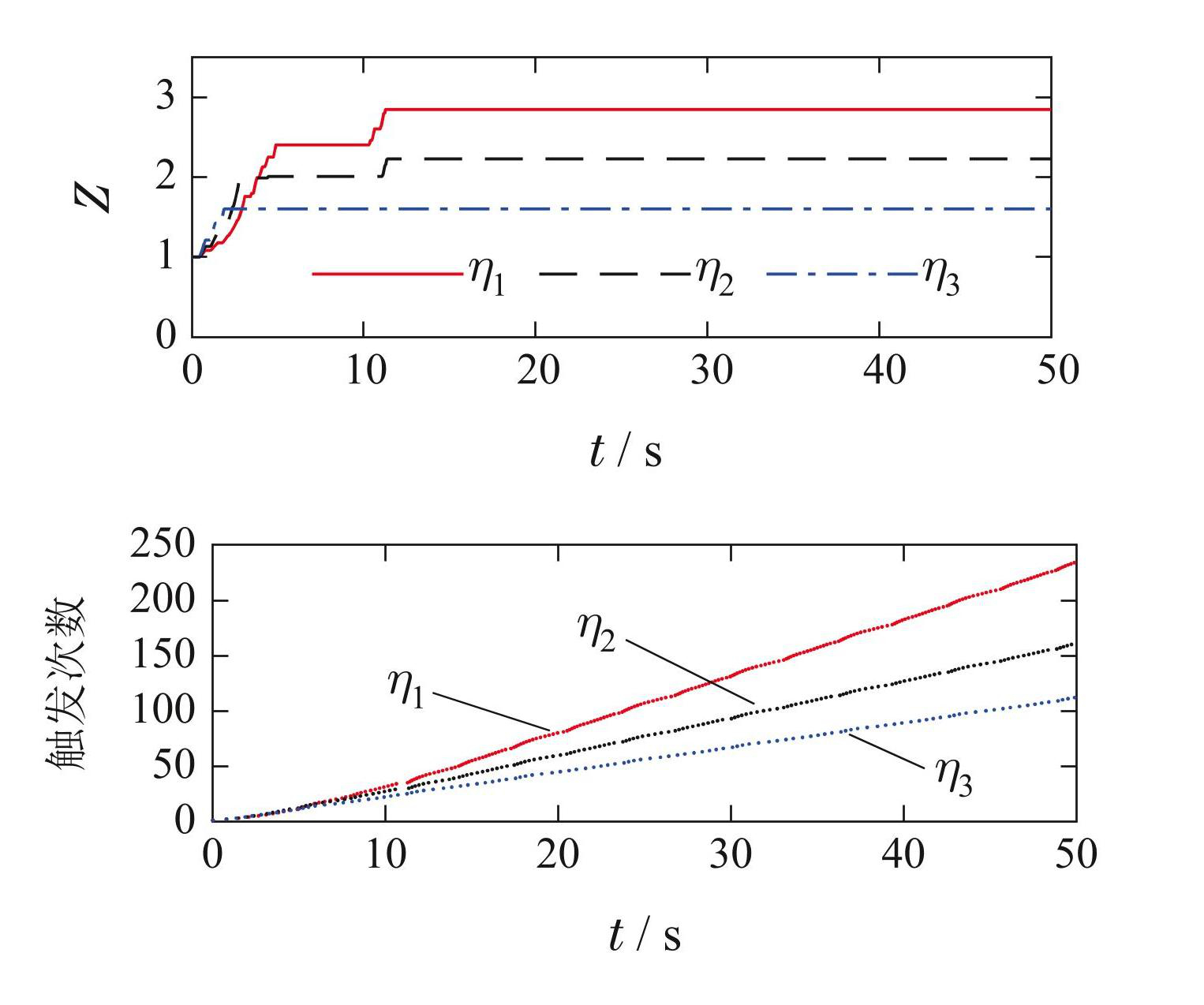 为了检验本文事件触发策略能否实现控制性能与通信负载的平衡,在不同目标精度下进行了仿真实验. 设置目标精度由高到低分别为: η1 = [0.05 0.02]T,η2 = [0.1 0.05]T,η3 = [0.2 0.1]T. 实验2的其他相关参数设置与实验1相同. 仿真结果如图8–10所示.