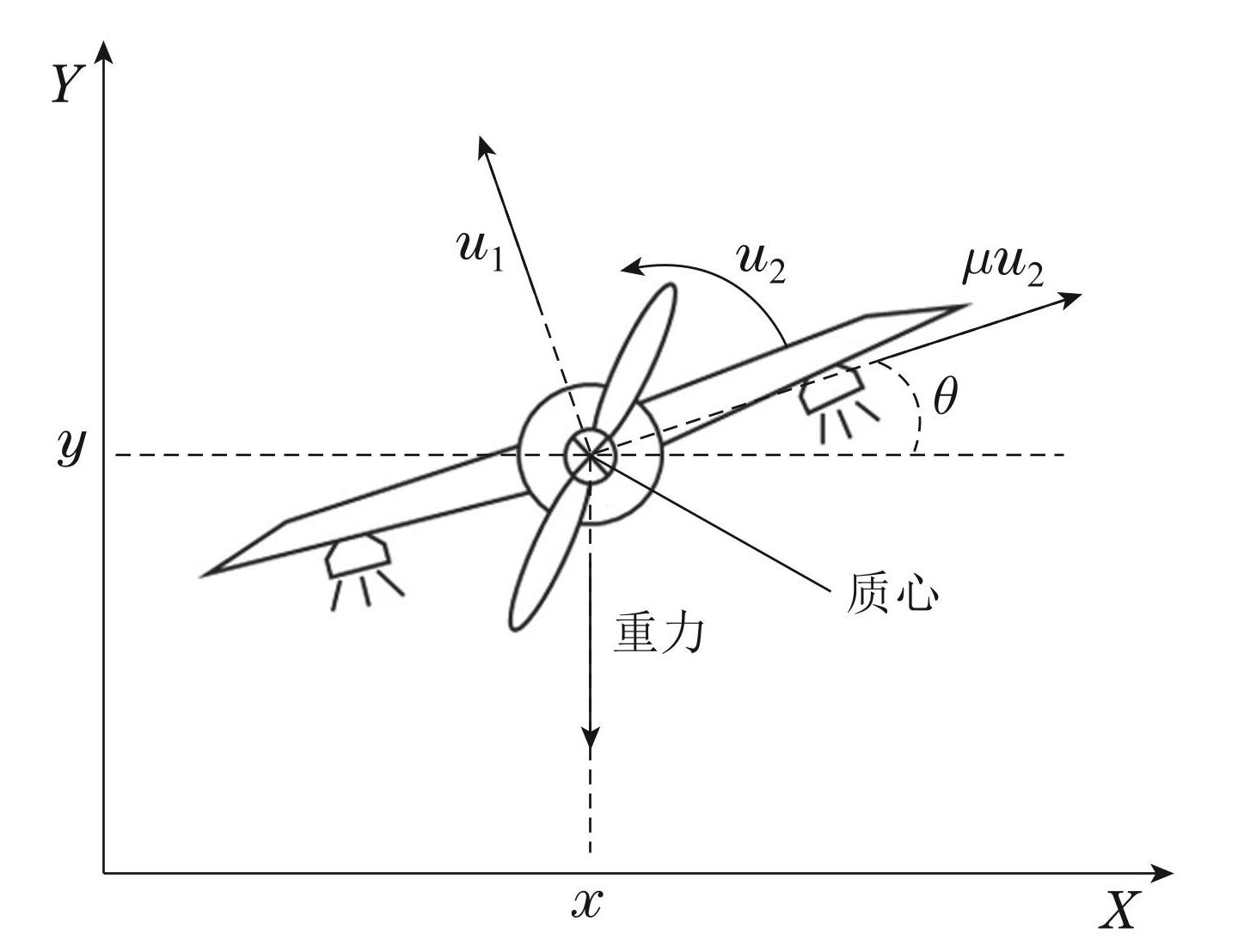 平面垂直起降(planar vertical take-off and landing,PVTOL)飞行器是非线性欠驱动系统的一个典型案例. 一些广泛应用的飞行器,例如Wingtra测绘无人机、喷气式战斗机、小型电子火箭等,都属于PVTOL飞行器 [30] . 该飞行器模型可以假设成一个具有三个自由度和两个控制输入的欠驱动系统,运动简图如图3所示. 系统的动力学方程为
