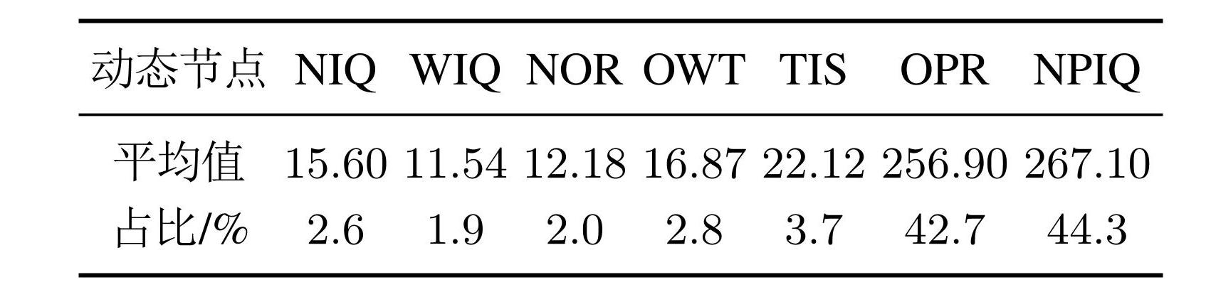 实验分训练阶段与测试阶段,训练阶段每次迭代通过评估相同动态场景进化调度规则,测试阶段使用表现最优的调度规则实时响应动态事件. 新作业到达时,该最优调度规则会根据车间信息进行决策,从而保证重调度的实时性. 最终以30次测试的平均适应度值作为本次训练结果,独立运行30次,取测试阶段平均适应度值评估算法性能. 需注意,ISP修正适应度值仅用于种群进化,评估算法性能仍用原适应度值,以保证对比实验适应度值范围一致. 此外,ISP需计算各动态终端节点占总运行时间的比例,表5列出各动态终端节点10次独立的时间(单位: ms)均值及占比. Ops 增加会显著提升问题求解难度. 为探究ISP对GP算法的影响,本文按Ops=3,4,5设置3个生产场景,将CCGP,TTGP分别结合ISP形成CCGP-ISP,TTGP-ISP,验证ISP在不同GP个体构建场景下的表现.