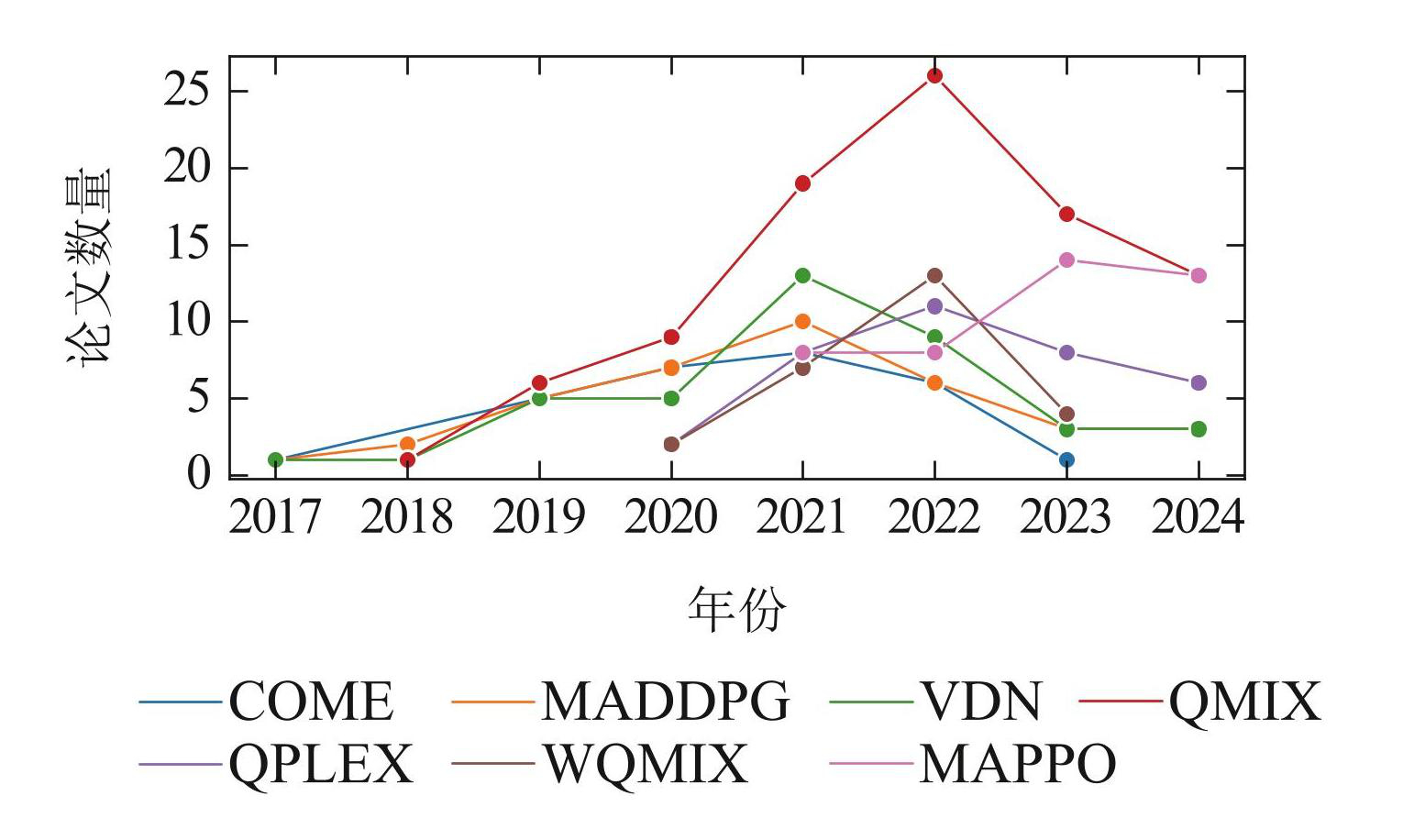 然而,现有研究缺乏一个系统的视角来全面评估 CTDE框架下的MARL算法,且算法的实际表现往往与理论性质不一致. 理论上的改进有时反而导致实际性能的下降. 从统计数据 [14](图1–2)来看,近年来该领域的方法呈现出下降趋势,而最常用的方法,尤其是在2023和2024年,仍然是2018年和2021年提出的经典方法QMIX [11] 和多智能体近端策略优化(multi-agent proximal policy optimization,MAPPO)[13] . 这表明该领域的发展可能已接近瓶颈期,亟需新的视角和研究方向. 鉴于此,本文回顾了CTDE框架下的主要MARL算法,并提出新的分析视角,以更深入地理解这些算法的有效性. 本文的目标是为读者提供全面深入的理解,并为后续的算法改进和研究提供启示.