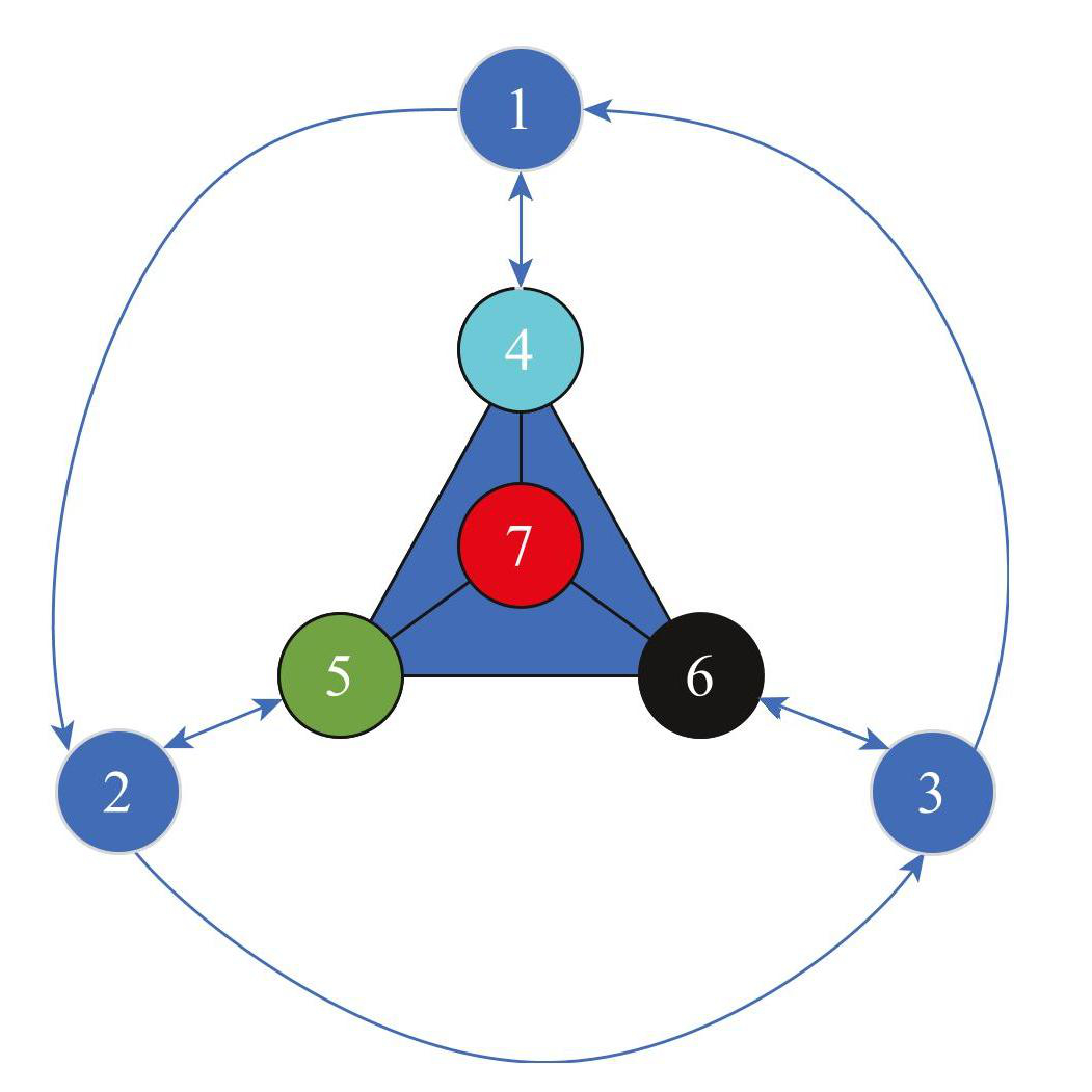 注 1 本文提出的神经网络模型(3)在交互方式和拓扑结构方面具有显著创新性. 与经典的神经网络模型,如BAM 神经网络 [35]、Cohen-Grossberg神经网络 [36] 和Hopfield神经网络 [37] 仅考虑神经元之间二元交互不同,神经网络模型(3)不仅考虑了二元交互,而且考虑了神经元之间的高阶交互作用,即神经元4,5,6,7中任意一个神经元都受到其他3个神经元的三阶交互作用,这是一种高阶交互方式. 此外,神经元 1,2,3之间形成单向二元交互、神经元1和神经元4、神经元2 和神经元5、神经元3和神经元6之间为双向二元交互. 在拓扑结构上,与已有的环形神经网络 [38] 和星形神经网络 [39] 不同,神经网络模型(3)具有环形和星形复合结构,更符合大脑功能模块的生物神经网络特征.