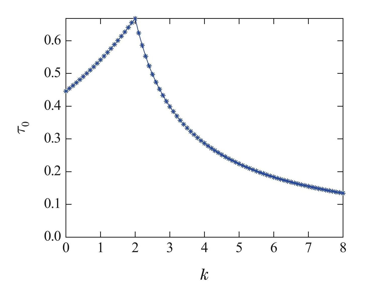 图5高阶耦合系数k与分岔阈值τ0的关系曲线