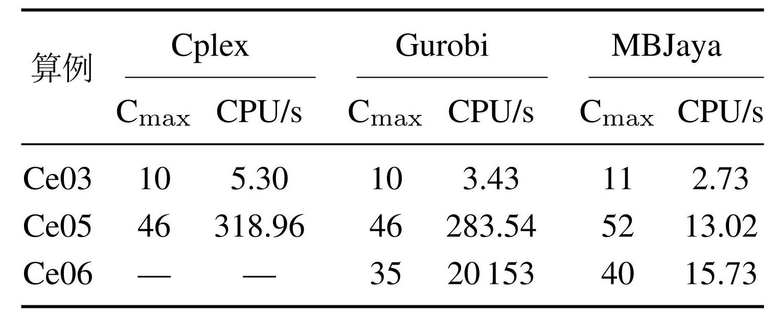 由表6可知,在Ce03和Ce05中,MBJaya求解得到的完工时间分别为11和52,而Cplex和Gurobi求出最优解完工时间都为10和46,虽然求解器能求出较优解,但运行时间较长,且Gurobi较Cplex求解速度快. 在 Ce06中,Cplex未能求出最优解,Gurobi在很长时间内求解出较优解35,MBJaya求解得到的完工时间为40. 通过与求解器对比,验证了模型的准确性和MBJaya 的有效性.