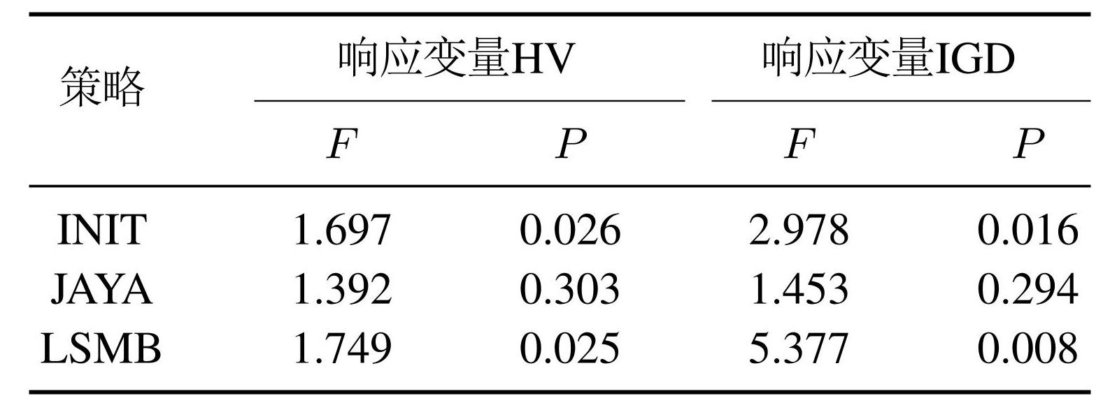 为了评估算法中的3种主要改进策略的影响,将 8种算法在MTMK05得到的各算法最终的非支配解集,计算HV和IGD值,采用多元方差分析,HV和IGD 分别作为响应变量,F值和P值用于分析实验结果. F值用于衡量该因素对结果的影响,P值用于测试每个因素的不同水平之间是否存在显著差异. MBJaya 的分析结果如表8所示, F的值越大,则该策略对算法的影响越大,当P值小于0.05时,表明该策略的影响程度与其他策略有显著差异.