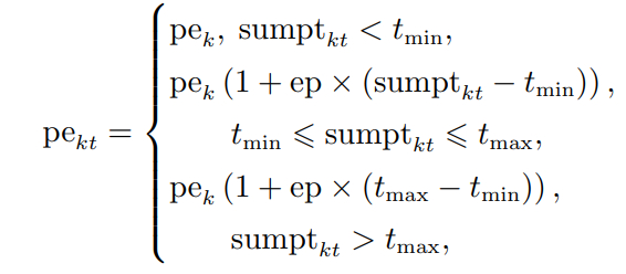 式中: pek为机器 Mk 的初始单位加工能耗,[tmin,tmax]为累计加工负载sumptkt对pek的影响范围,ep 为增长率. 其他各能耗的计算公式如下: