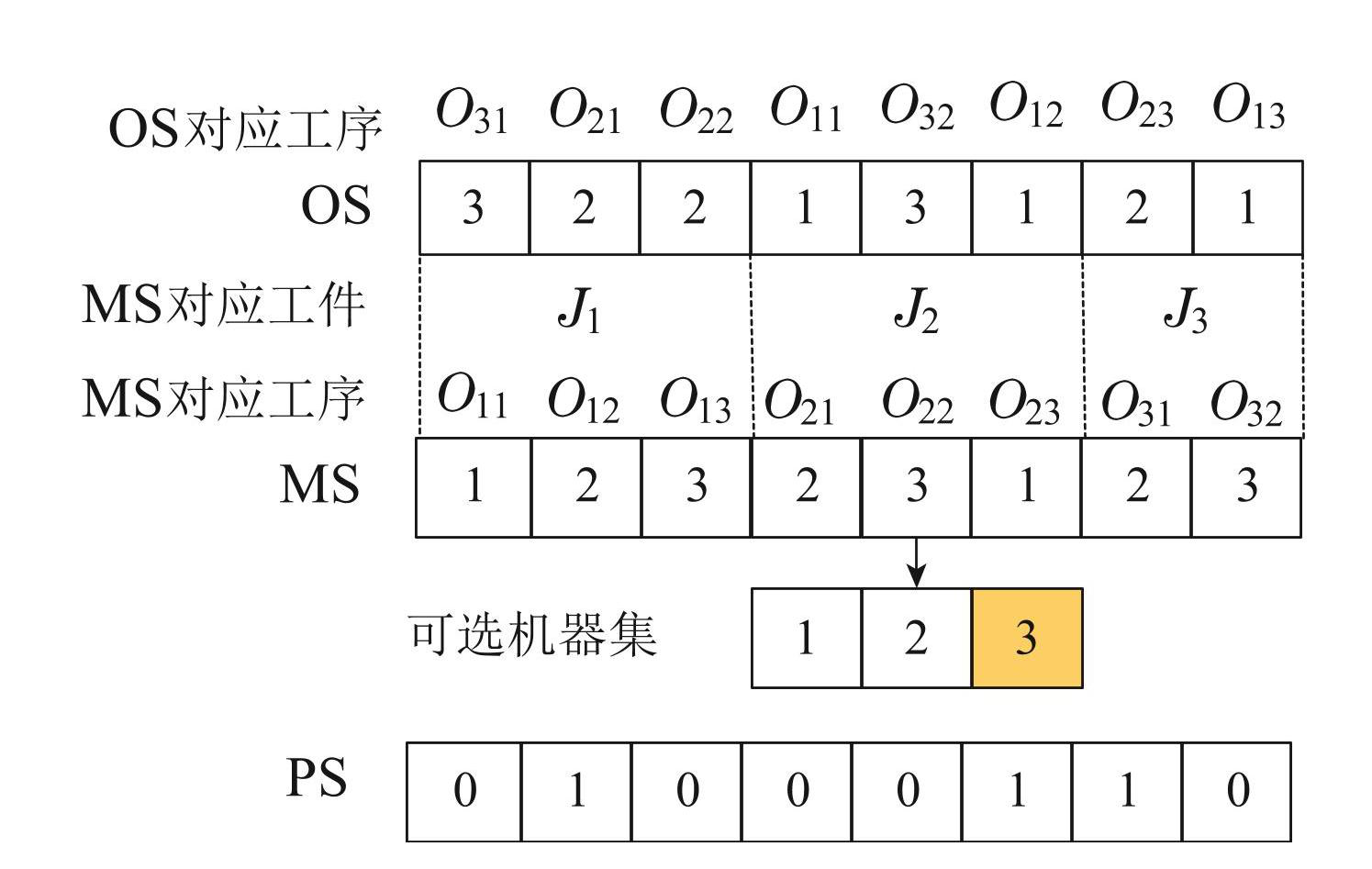 FJGSPPMT分为机器选择(machines selection,MS)、工序排序(operations sequence,OS)和预保养选择(pre-maintenance selection,PS)3个子问题,因此编码采用整数编码生成 MS,OS和PS 3层编码串. 以表2描述的示例为例,编码过程如图1所示.