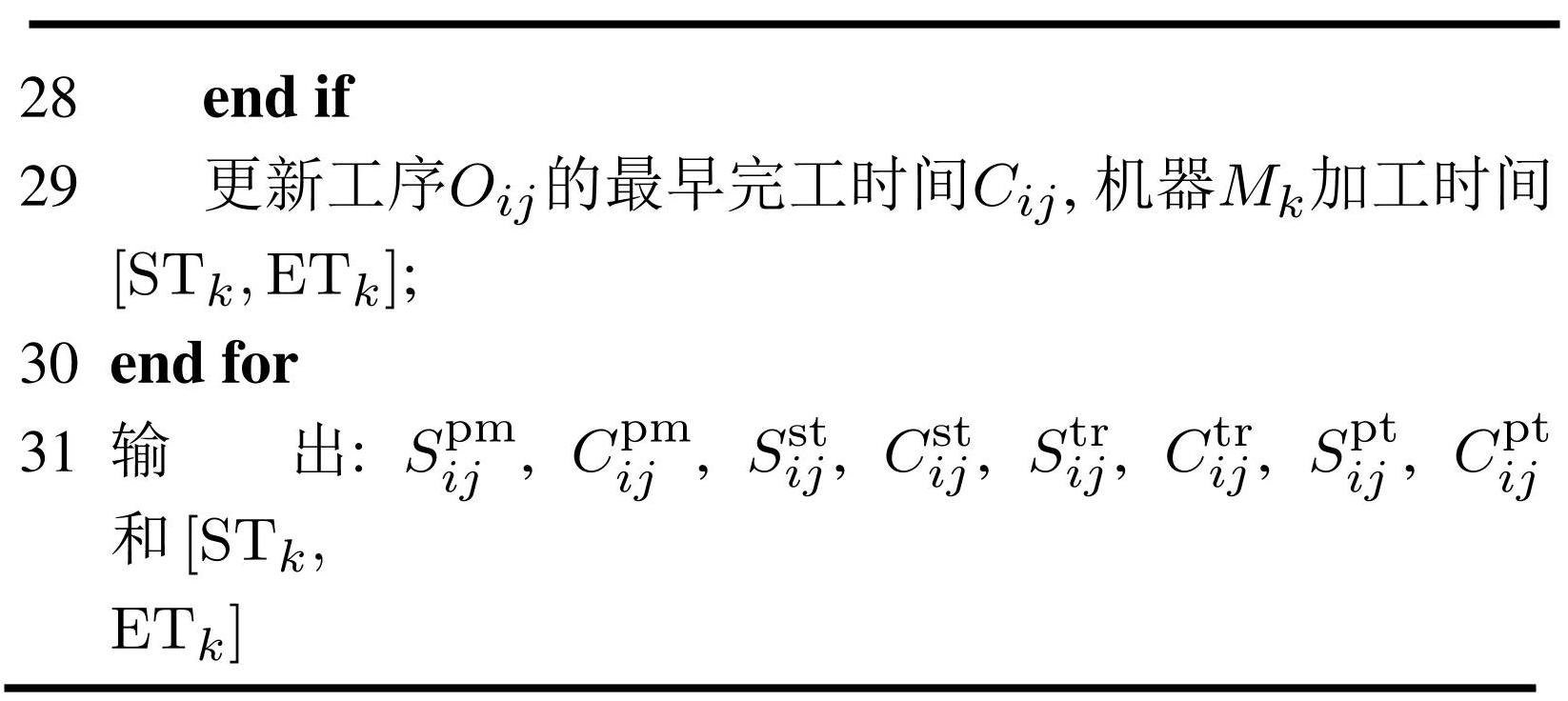 其中: 式(12)–(15)表示决策变量; 式(16)–(17)表示同一个工件的工序具有加工顺序约束; 式(18)表示同一台机器上的相邻工序之间有设置时间约束; 式(19)表示机器上的保养时间约束,若选择在加工Oij前进行预保养,则需要先花费pmk时间对Mk预保养,才能开始对工件的设置或加工; 式(20)表示工件的完工时间约束,即每一个工件的完工时间不可能超过总的完工时间; 式(21)表示任意时刻一台机器只能加工一道工序; 式(22)表示在某一时刻一道工序只能由一台机器加工; 式(23)表示各个参数均非负.