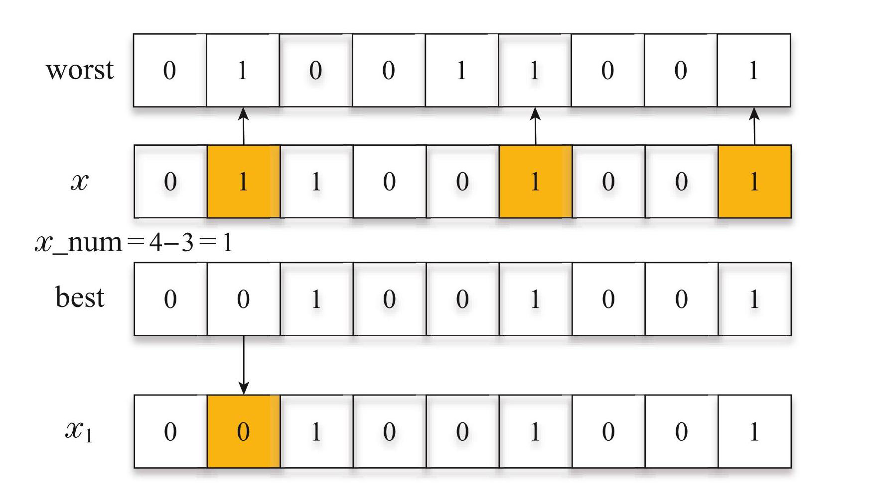步骤 2 若x_num <0,则遍历x,找出与最劣个体worst中PS都为0的基因位并标记; 若x_num >0,则找出x与worst中PS都为1的基因位并标记.