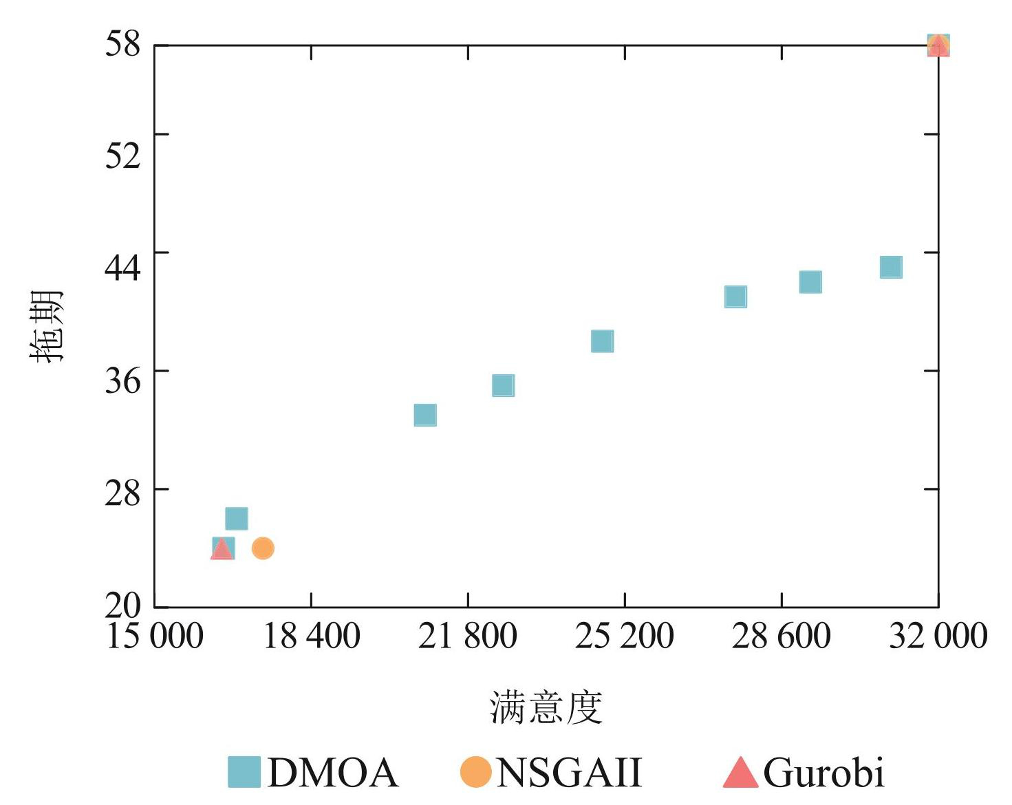 DMOA算法初始化阶段为单目标启发式,采用最小拖期规则生成初始解的计算复杂度为 O(2 × F × m),采用最大满意度规则生成初始解的复杂度为 O(F × n × m),其中F,n,m分别为工厂、物料和仓库数. 在解码过程中,对工厂供应优先级排序复杂度为O(m × FlogF),拖期与满意度目标计算复杂度为 O(F × n × m). 自适应路径重连机制中计算差异矩阵的复杂度为O(F ×n× m),物料数量交换复杂度为 O(F × n × m),通过解码产生非支配解的复杂度为O(F2 × n 2 × m2). 局部增强搜索阶段的4种搜索策略复杂度为O(4S × n × F × n × m),其中S为当前 Pareto解集规模. 综合各环节的总体计算复杂度为 O(F2 × n 2 × m2),DMOA算法的整体计算复杂度并不高,能够高效完成优化过程.