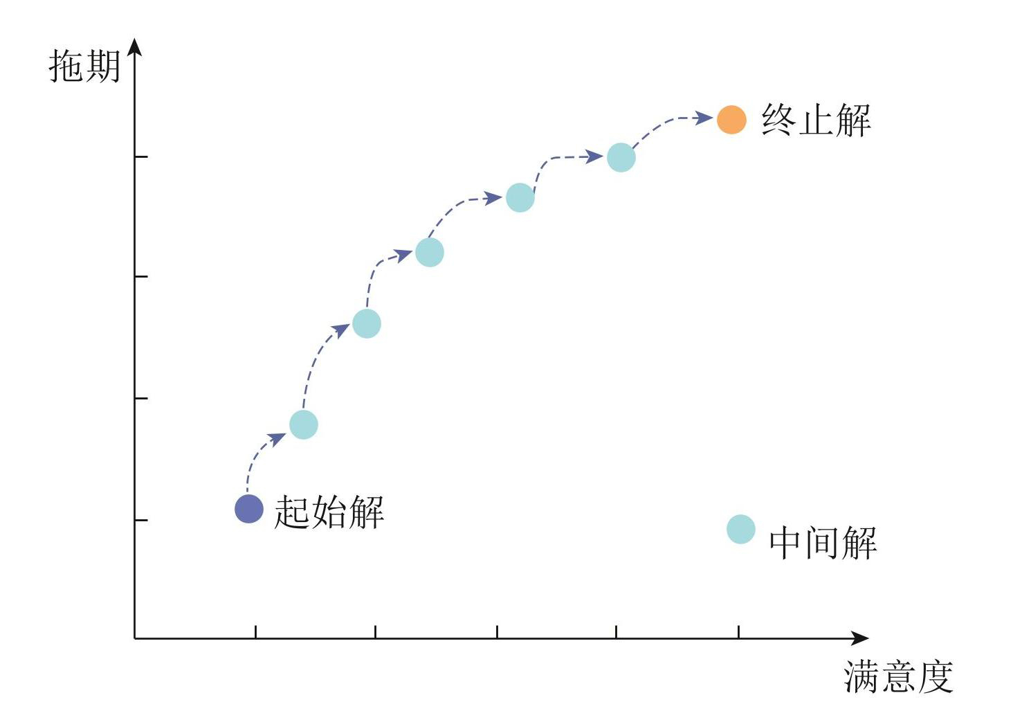 为生成多样且高质的Pareto前沿,将数模双驱的初始化方法中得到的两个单目标最优解分别作为目标空间的起始解和终止解,通过路径重连机制,构建路径重连过程中产生的候选解PathSet. 两个单目标上的初始优化解能够互相在不同目标上进行引导,其结构差异为DMOA提供了丰富的搜索空间,有助于挖掘更多高质量的非支配解. 为高效探索两个初始解间的路径,本文提出了一种自适应路径重连机制,如图2所示. 起始解为拖期目标上的最优解,终止解为满意度目标上的最优解,通过量化起始解与终止解之间的差异,逐步缩小两解差异即可依箭头方向逐步生成多个中间解,以在自适应降低差异过程中提升算法在目标空间的全局探索能力,具体如下.